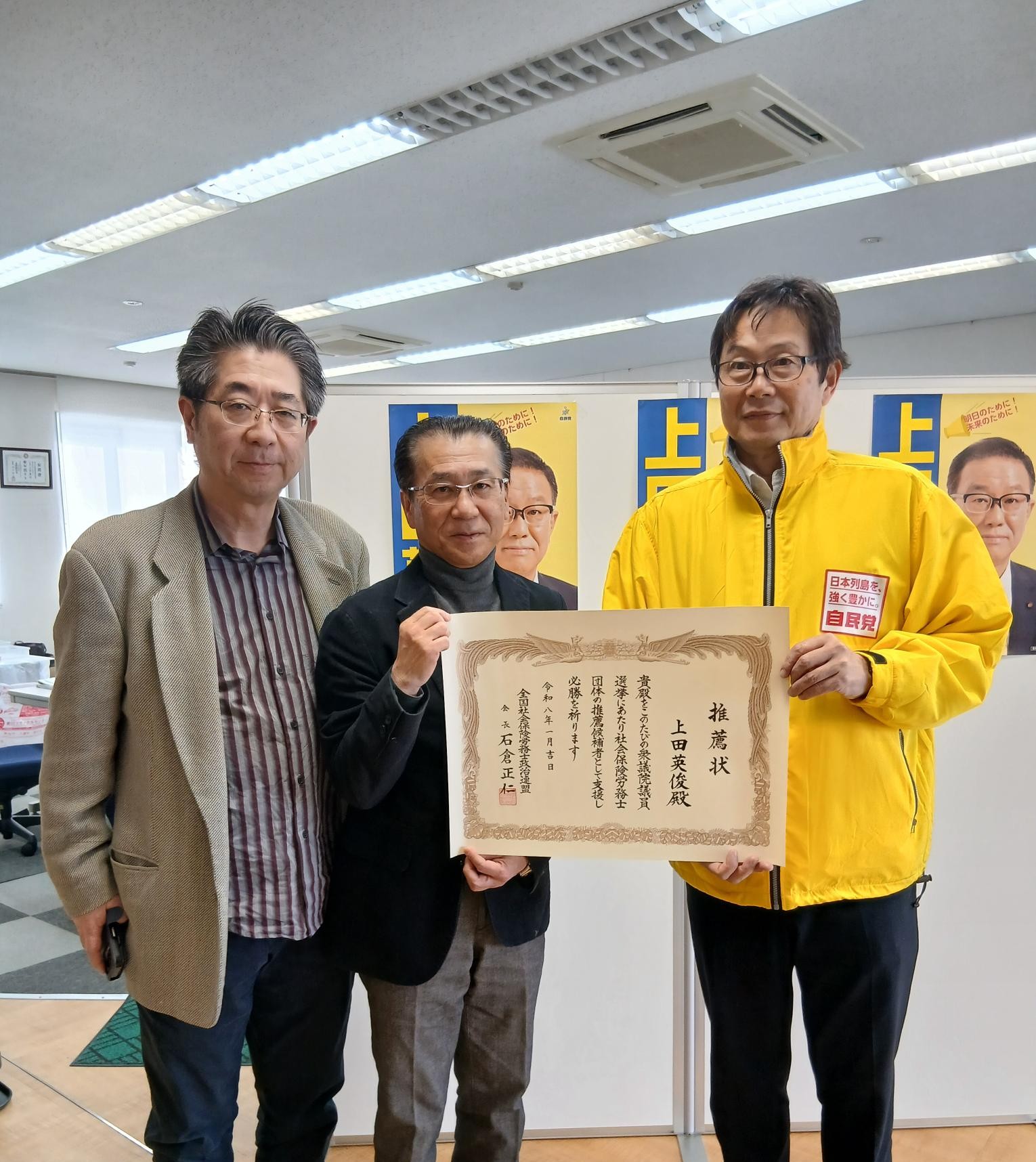 2月1日、石倉正仁会長は、衆議院議員総選挙の推薦候補者を応援するため、山下誠富山会会長と共に、上田英俊候補(自由民主党・選挙区:富山県)の選挙事務所を訪問しました。