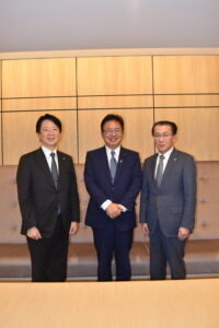 10月31日、高市内閣の発足において新たに厚生労働大臣に就任された上野賢一郎氏が、就任の挨拶のため連合会に来訪され、石倉正仁会長(連合会副会長)と若林正清連合会会長がお迎えしました。