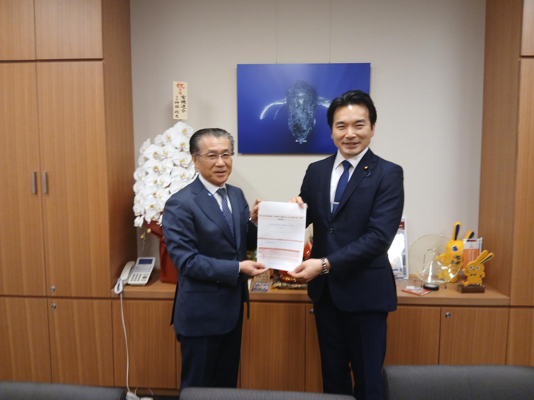 3月4日、石倉正仁会長は、議員会館を訪問し、国民民主党社会保険労務士制度推進議員連盟の浅野哲議員に、衆議院選挙の当選祝いの挨拶をしました。