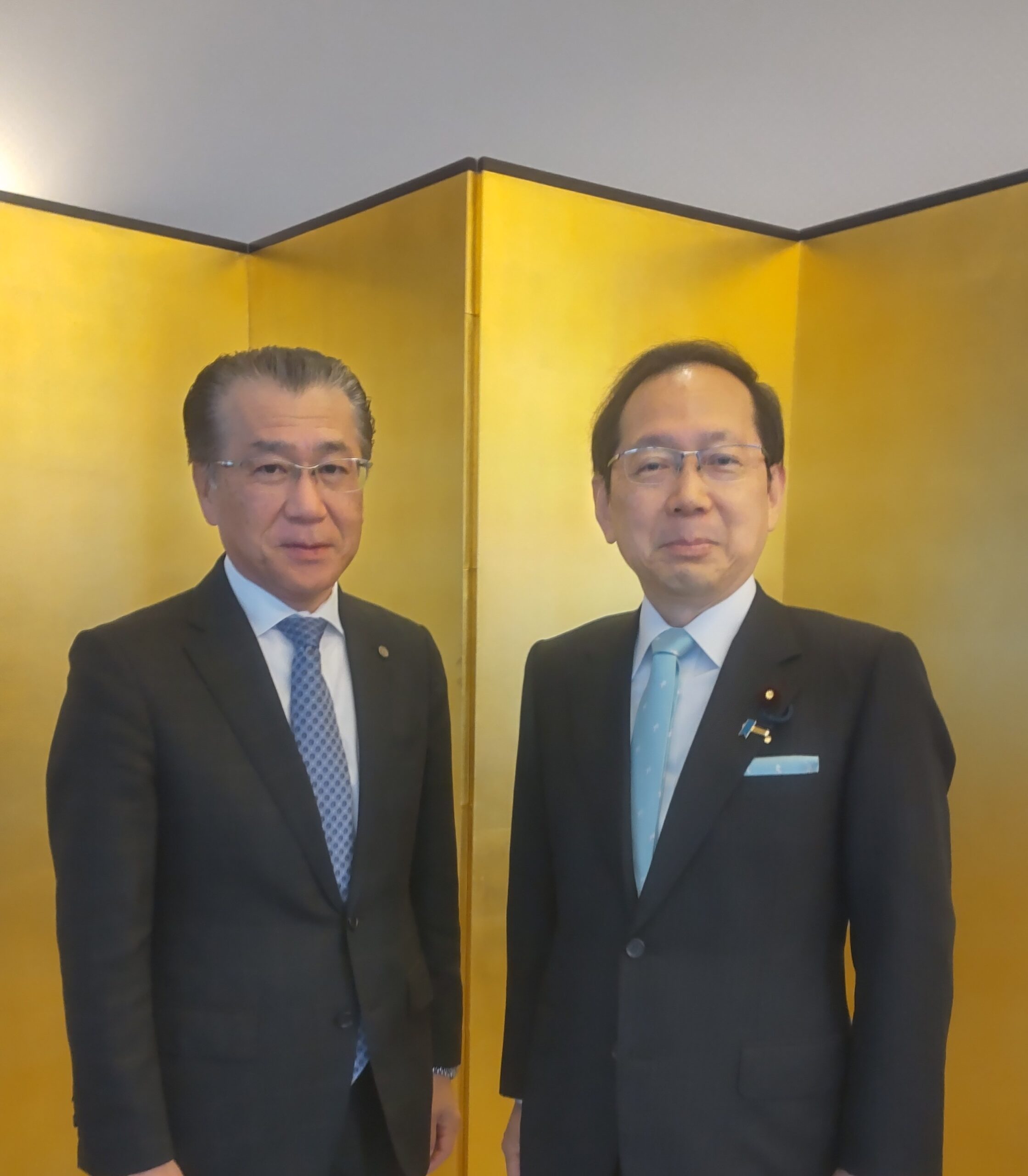10月31日、高市内閣の発足において新たに厚生労働大臣に就任された上野賢一郎氏が、就任の挨拶のため連合会に来訪され、石倉正仁会長(連合会副会長)と若林正清連合会会長がお迎えしました。