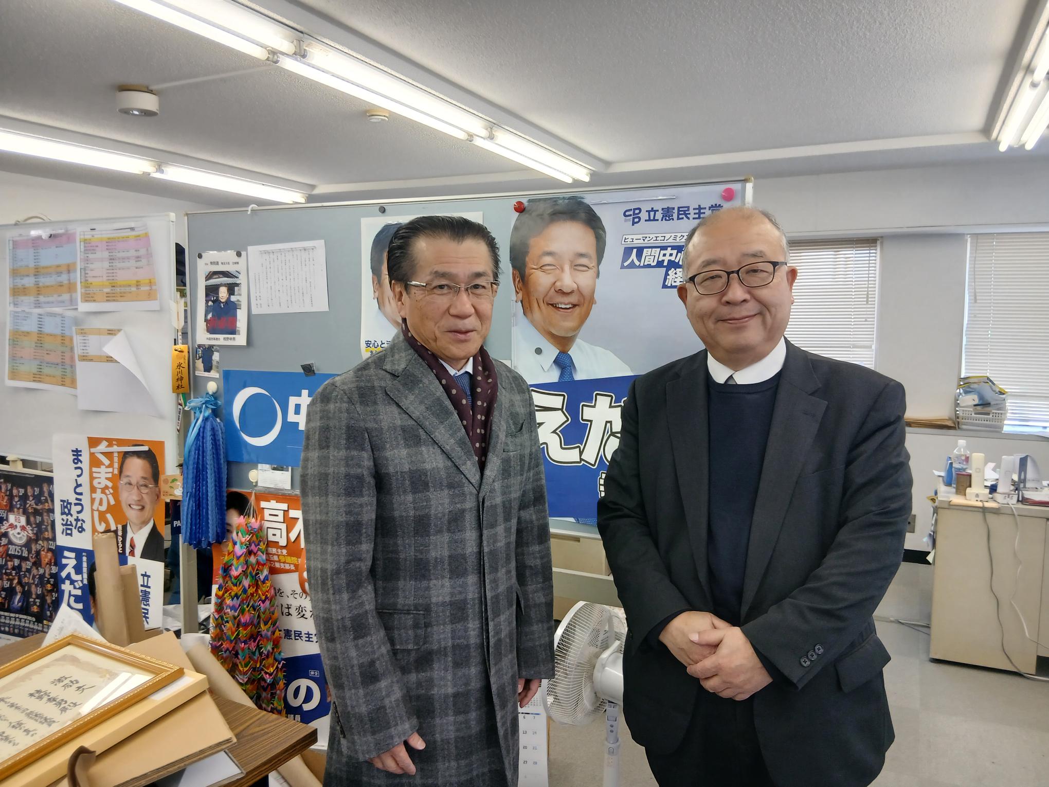 1月28日、石倉正仁会長は、衆議院議員総選挙の推薦候補者を応援するため、枝野幸男候補(中道改革連合・選挙区:埼玉県)の選挙事務所を訪問しました。