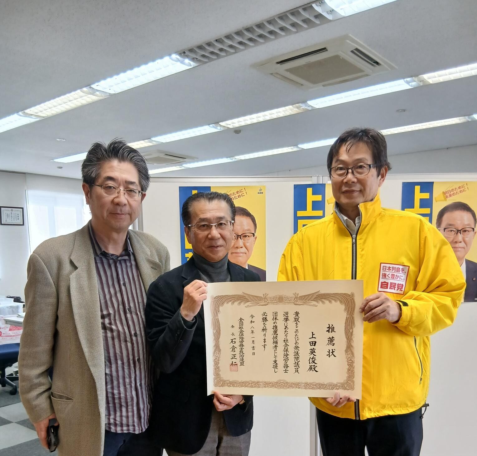 2月1日、石倉正仁会長は、衆議院議員総選挙の推薦候補者を応援するため、山下誠富山会会長と共に、上田英俊候補(自由民主党・選挙区:富山県)の選挙事務所を訪問しました。