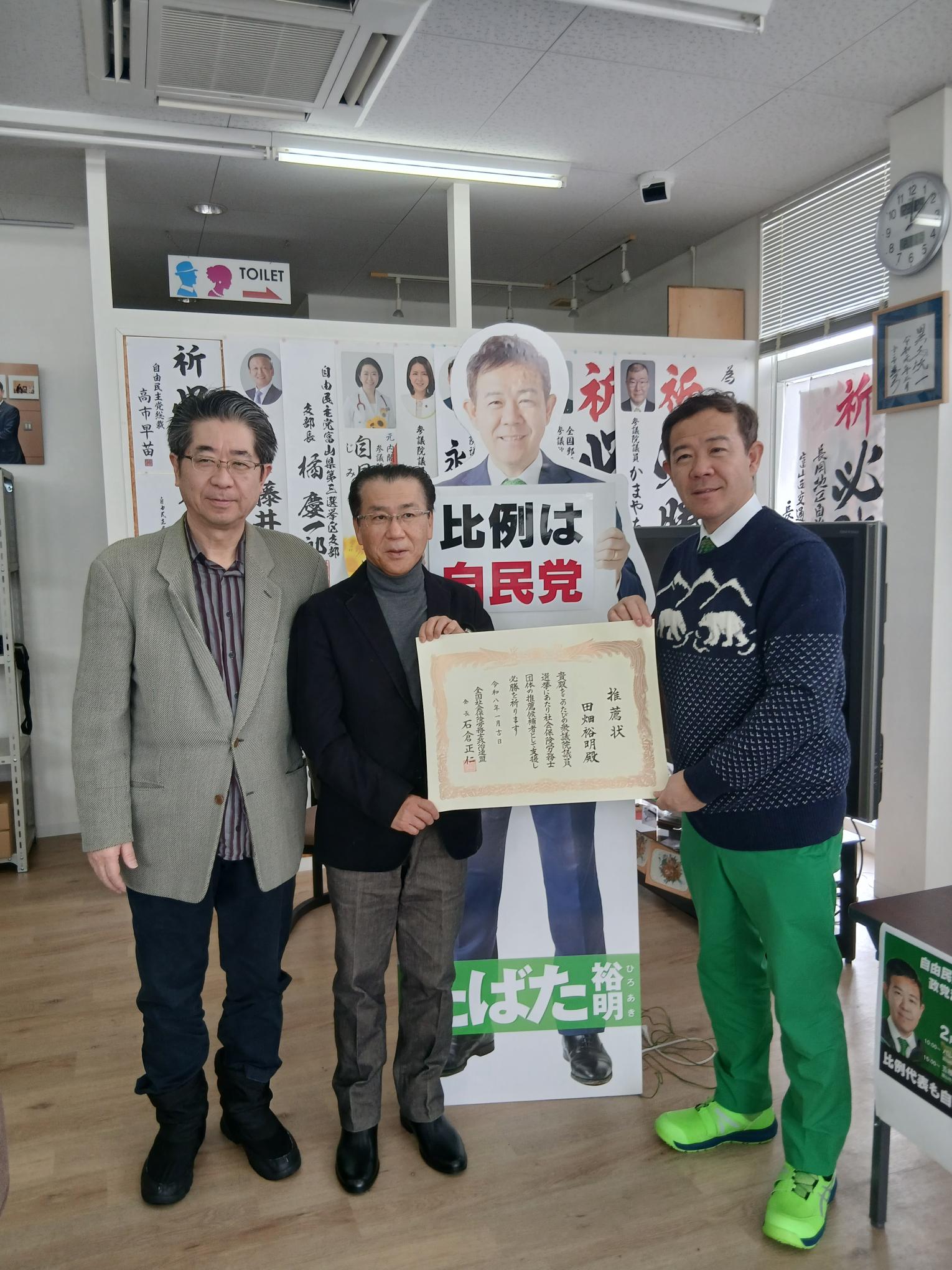 2月1日、石倉正仁会長は、衆議院議員総選挙の推薦候補者を応援するため、山下誠富山会会長と共に、田畑裕明候補(自由民主党・選挙区:富山県)の選挙事務所を訪問しました。
